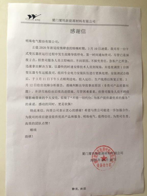 盡管過程充滿艱難險阻,但明珠團隊不顧個人安危,憑借敬業精神,客戶為之深深感動和欽佩!我們用自身的實力和執行力將此事件造成的不利影響降到最低。“明珠電氣,值得信任,為貴司負責任、高效的團隊點贊!”面對客戶感謝信中給予我們的肯定和贊賞,內心充滿了無限的感動,更增強了我們努力提供好服務的無限信心和動力!